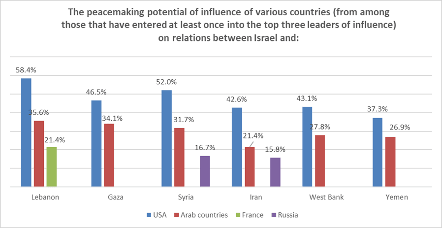 According to our research, Israelis identify four countries capable of exerting certain influence on achieving peace agreements between Israel and its neighbors: the United States, Arab countries (UAE, Saudi Arabia, Egypt, Qatar), Russia, and France.